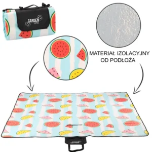 Egy nagyobb családi pikniken, tengerparti pihenésen vagy fesztiválon is kényelmes alapot nyújt ez a háromrétegű, gyümölcs mintás pikniktakaró.