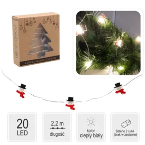 Varázsolj mesés, ünnepi hangulatot otthonodba ezzel a bájos hóemberes LED fényfüzérrel! A melegfehér fényű, 20 darab LED-ből álló lánc bármely polcra, ablakkeretre vagy asztali dekorációhoz rögzíthető, hiszen elemes működésének köszönhetően nincs szükség konnektorra.
