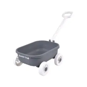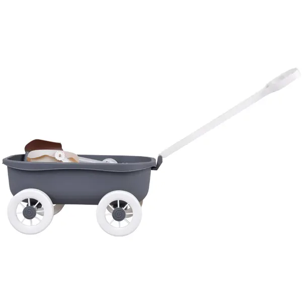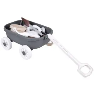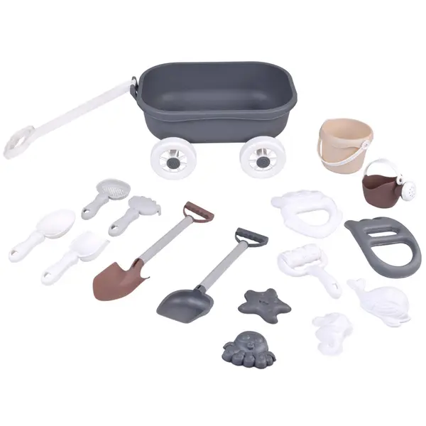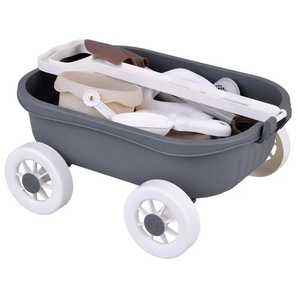A praktikus kocsi megkönnyíti az összes tartozék szállítását, így a játék rendben tartható, a gyerekek pedig önállóan pakolhatnak és vihetik magukkal a felszerelést. A tartós műanyag jól bírja a vizet és a homokot, a modern szürke–fehér–bézs színvilág pedig letisztult, esztétikus megjelenést ad.