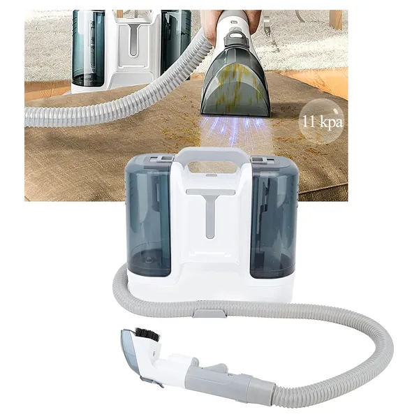 A hordozható, 450 W teljesítményű kárpittisztító porszívó ideális szőnyegek, kanapék, autóülések és más textilfelületek gyors és alapos tisztításához. Erős, 11 kPa szívóerejű motorja mélyen a szálak közé hatol, hogy hatékonyan eltávolítsa a makacs foltokat, port és állatszőrt.
