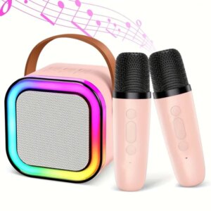 Hordozható karaoke szett Bluetooth hangszóróval, LED RGB, 2 rózsaszín mikrofon