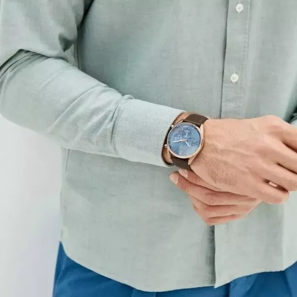 Elegáns, mégis sportos karóra sötétkék számlappal és kényelmes barna bőrszíjjal, amely könnyen illeszkedik hétköznapi és alkalmi viselethez. A dátum és a kronográf segít a pontos időkövetésben, a WR100 vízállóság pedig nyugodt használatot ad úszásnál és mindennapi helyzetekben is.