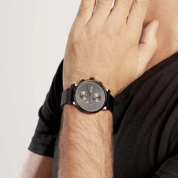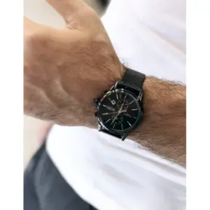 Elegáns, teljesen fekete megjelenésű karóra ásványüveggel és tartós, bevonatos rozsdamentes acél tokkal/csattal. A dátumkijelzés, a kronográf és a 24 órás kijelzés kényelmesen használható a mindennapokban, a WR50 vízállóság pedig a hétköznapi fröccsenések ellen véd.