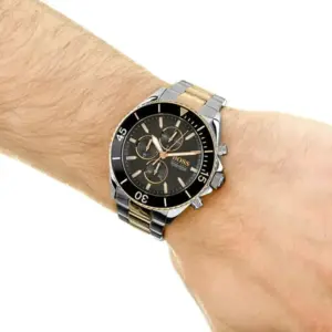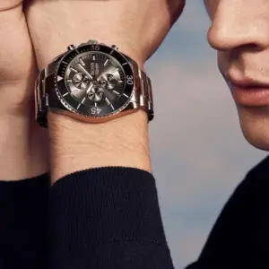 Rozsdamentes acél, PVD-rozéarany részletek és fekete számlap elegáns, mégis sportos megjelenéssel. A WR100 vízállóság és a kronográf praktikus társ a mindennapokban, ajándékdobozban érkezik.