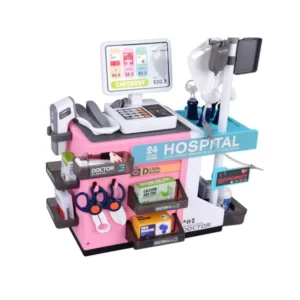 Valósághű klinika–patika szerepjáték hangokkal: szívhangos sztetoszkóp, csipogó hőmérő, pénztárgép és kártyás fizetés. A sok kiegészítő segít oldani az orvostól való félelmet, fejleszti a kommunikációt és az empátiát, miközben a gyerekek önfeledten játszanak.