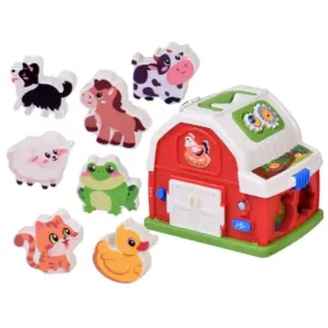 Interaktív farmház 12 hónapos kortól – egy élményekkel teli, hangos-zenélős formabedobó, amely játék közben tanítja a kicsiket az állatok, hangok, formák és színek világára.