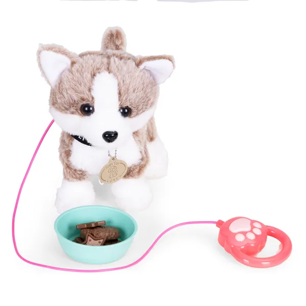 Interaktív plüss husky kutya pórázzal, sétál és zenél, etető szett