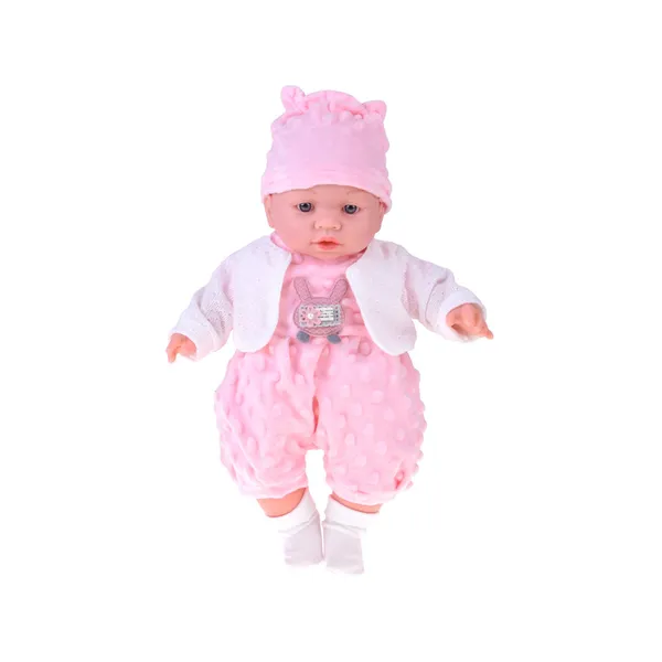 • Ruházat: rózsaszín rugdalózó díszítéssel, fülecskés sapka, fehér kardigán és zokni.