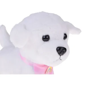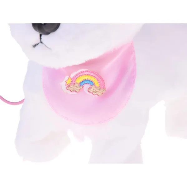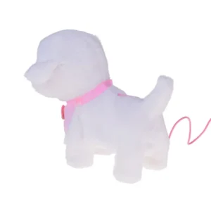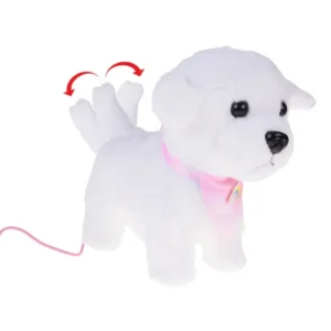 A puha tapintású, fehér plüsskutya valósághű élményt kínál: gombnyomásra elindul, aranyosan ugat és vidáman csóválja a farkát. A 75 cm-es vezetőpóráznak köszönhetően a gyerekek könnyedén „sétáltathatják” új kedvencüket a lakásban vagy a kertben.