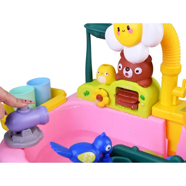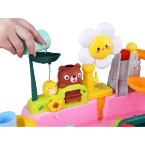A működő „zuhany”, a csúszda és a vízben mozgó elemek órákra lekötik a gyerekeket: lehet locsolni, halacskákat „horgászni”, a kis csónakkal játszani, vagy a játék gyümölcsöket és zöldségeket „megmosni”. A játék közben fejlődik a kézügyesség, a szem-kéz koordináció és a képzelőerő.