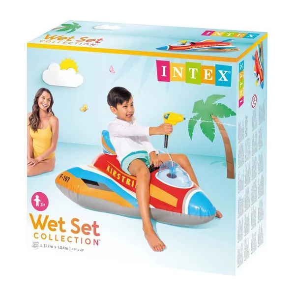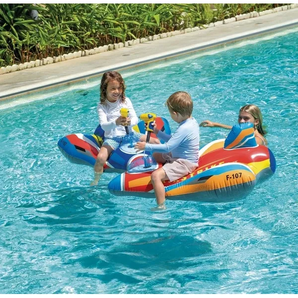 INTEX felfújható vadászgép úszómatrac gyerekeknek remek választás medencéhez, tópartra és nyári utazásokhoz. A különleges repülőgép forma még izgalmasabbá teszi a vízi játékot, miközben a beépített vízipisztoly aktív, mozgásra ösztönző szórakozást nyújt.
