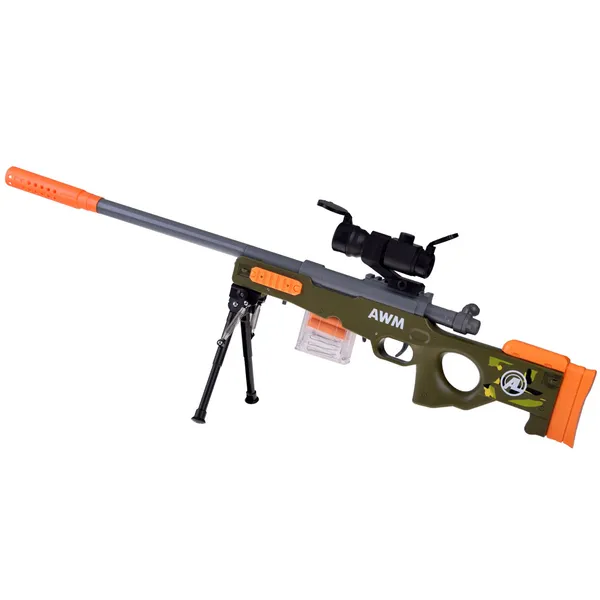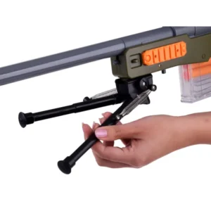 Az állítható távcső közelebb hozza a célpontot, a kihajtható bipod pedig stabil támaszt nyújt a pontos lövésekhez. A kivetődő hüvelyek látványosan fokozzák a realizmust, miközben a műanyag konstrukció könnyű, ezért hosszabb akciók során sem fárad el a kis katona.