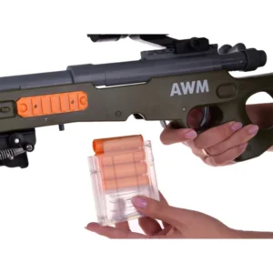 A mechanikus, elemmentes játék mesterlövész puska valósághű hüvelykivetéssel, állítható távcsővel és 20 puha lövedékkel teszi biztonságossá és izgalmassá a célba lövést. A könnyű, 88 cm-es fegyver cserélhető tárral és kihajtható bipoddal órákig leköti a gyerekeket.