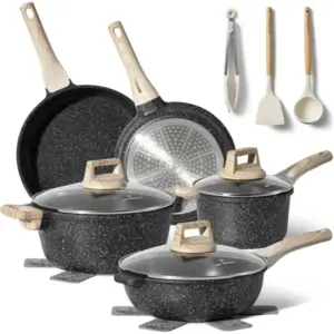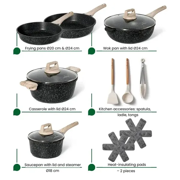 A tapadásmentes gránit bevonatnak és az egyenletes hőeloszlásnak köszönhetően kevesebb olajjal, kényelmesebben főzhet, miközben a tisztítás is gyorsabb. A komplett, 13 részes készlet indukciós főzőlappal is használható, így sokoldalú és praktikus választás a mindennapokra.