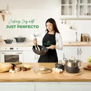 A Just Perfecto JL-32 egy sokoldalú, 13 részes edénykészlet, amelyet a modern konyhák igényeire terveztek. A kovácsolt, öntött alumínium test és a gránit hatású kerámia tapadásmentes bevonat egyenletes hőeloszlást, kényelmes használatot és kevesebb olajjal történő főzést biztosít. Az elegáns fekete felület és a fa hatású, puha tapintású nyél prémium megjelenést ad a készletnek.