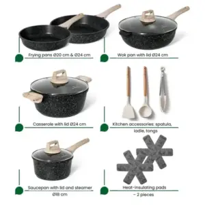 A készlet ideális mindennapi főzéshez, legyen szó pirításról, párolásról, szószkészítésről vagy wokban sütésről. Az indukcióval is kompatibilis alj széles körű felhasználást tesz lehetővé, a tapadásmentes felület pedig megkönnyíti a tisztítást.