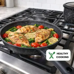 • Egészséges tapadásmentes bevonat – A kerámia gránit bevonat PFAS-, PTFE-, PFOA-, PFOS-, ólom- és kadmiummentes, így kevesebb olajjal is kényelmesen főzhet.