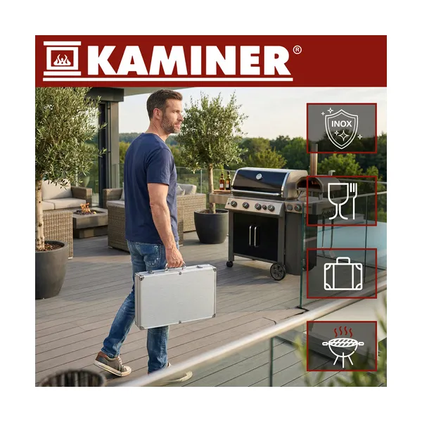 Rendszerezett, komplett grillfelszerelés egyetlen hordozható táskában. A 26 részes Kaminer készletben megtalálod a sütéshez és tálaláshoz szükséges alap eszközöket, mindegyiknek külön helye van a megerősített, XXL alumínium bőröndben. Így nem kallódnak el a kiegészítők, és induláskor elég csak felkapni a táskát.