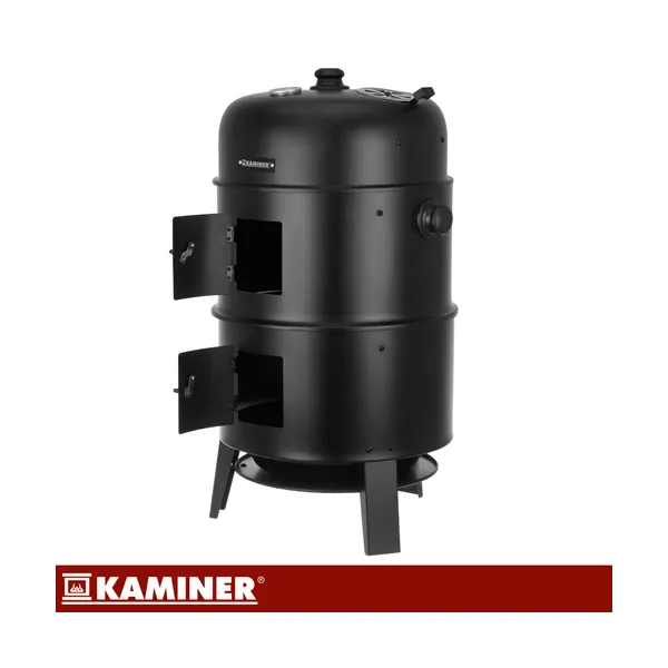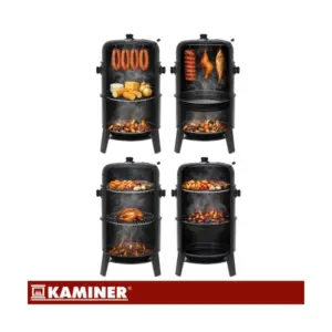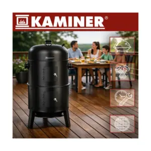 Kaminer faszenes kerti grill és füstölő praktikus, többfunkciós megoldás azoknak, akik nemcsak grillezni, hanem füstölni is szeretnének a kertben vagy a teraszon. A készülék egyetlen eszközben egyesíti a grillezés, a tűztér és a füstölés lehetőségét, így változatos ételek készíthetők benne egyszerűbben és jobban szabályozható hőfokon.