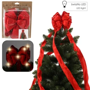 Hagyományos piros masni modern, energiatakarékos LED-fénnyel kombinálva, amely egy pillanat alatt csillogó koronát varázsol a karácsonyfára.