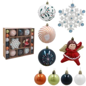A 38 darabból álló, törésálló díszkészlettel percek alatt egységes, mégis változatos karácsonyfa-dekorációt varázsolhatsz, miközben a vegyes színek és felületek ragyogó ünnepi hangulatot teremtenek.