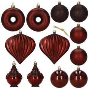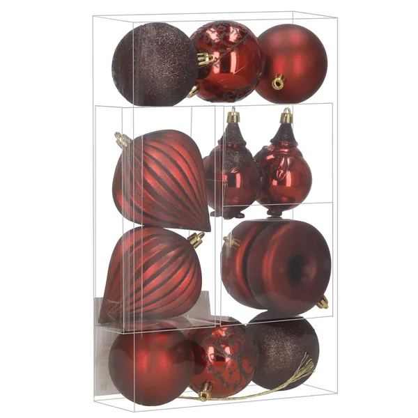 Piros, törhetetlen karácsonyfa díszek többféle felülettel és formával, hogy gyorsan egységes, látványos összhatást kapj a fán. A csomag 12 darabot tartalmaz, és ajándék akasztózsinórral érkezik, így azonnal feltehetők.