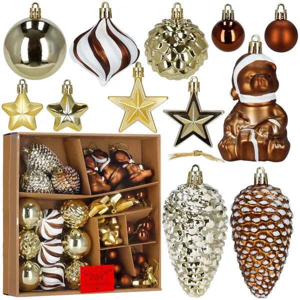 Harmonikus barna–arany–fehér színvilágú, 47 darabos karácsonyfa díszgömb szett többféle formával és felülettel (fényes/félmatt), hogy gyorsan egységes, elegáns összképet kapj. A mellékelt akasztózsinórokkal azonnal díszíthető, műanyag anyaga pedig könnyű és tartós.