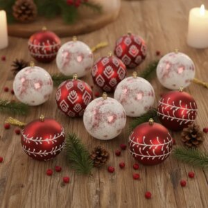 Dobd fel a karácsonyfát elegáns, piros-fehér gömbdíszekkel! A 12 darabos készlet többféle felülettel és mintával érkezik, így könnyen harmonikus, mégis változatos összhatást ad. A műanyag kivitelnek köszönhetően törhetetlen, ezért ideális gyerekek és háziállatok mellé is.