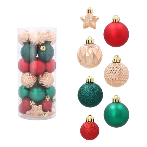 Dobd fel az ünnepi dekorációt ezzel a színekben és felületben gazdag, 32 darabos karácsonyfagömb szettel! A hagyományos piros, arany és zöld árnyalatok fényes, matt és csillámos kivitelben jelennek meg, így harmonikus, mégis izgalmas összhatást teremtenek a fán, koszorún vagy asztali kompozícióban.