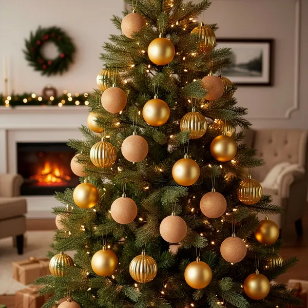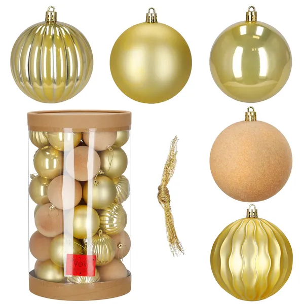 Változatos felületű, arany–ekrü díszgömb válogatás a gyors, látványos fa díszítéséhez. A törhetetlen műanyag kivitel nyugodtabb ünnepet ad gyerekek és háziállatok mellett is, az akasztó zsinórokkal pedig azonnal feltehető a fára.
