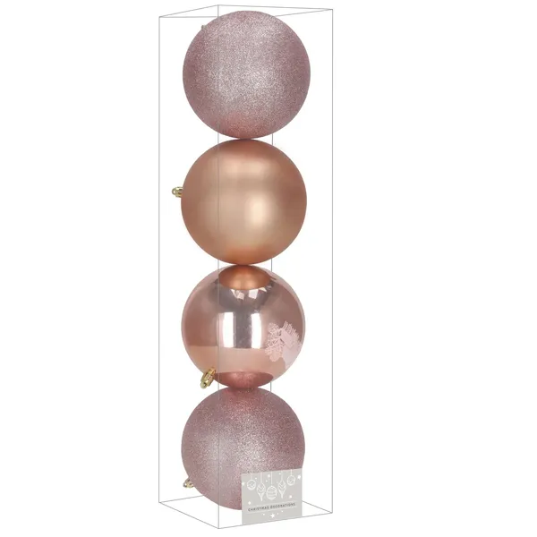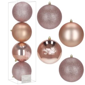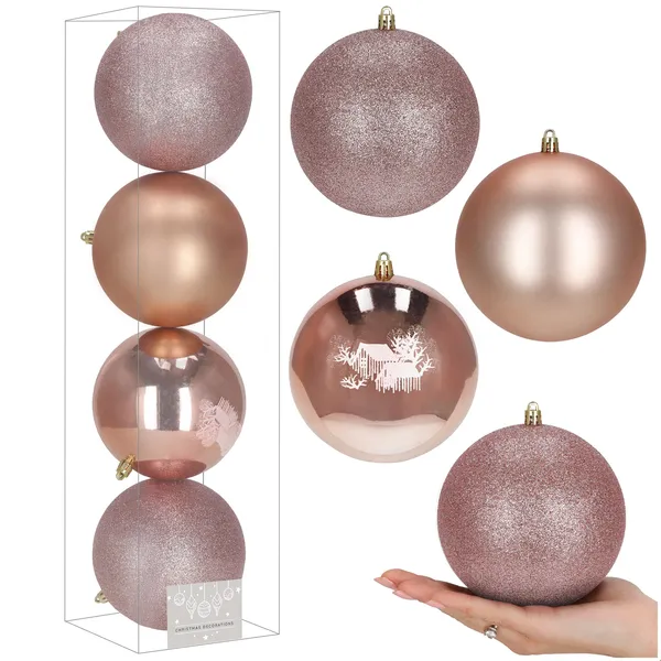 A 4 darabos, 12 cm-es rózsaszín-fehér gömbkészlet csillámos, félmatt és fényes felületével látványos csillogást ad a fának, miközben törhetetlen anyaga miatt biztonságos a család minden tagja számára.