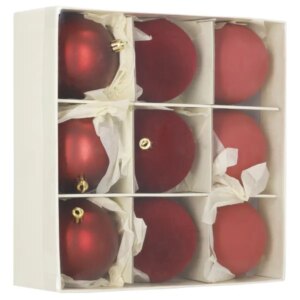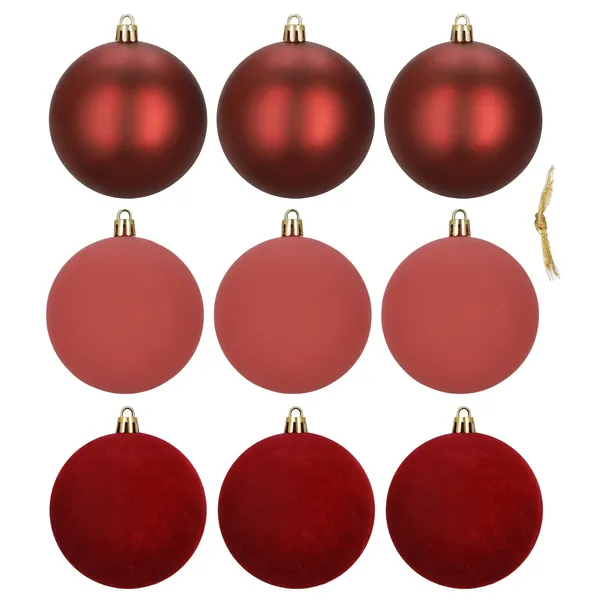 A 9 darabos, 8 cm-es bordó karácsonyfadísz készlet törhetetlen műanyagból készül, háromféle felülete változatos ragyogást ad, az előfűzött akasztózsinórok pedig gyerekjátékot csinálnak a dekorálásból.