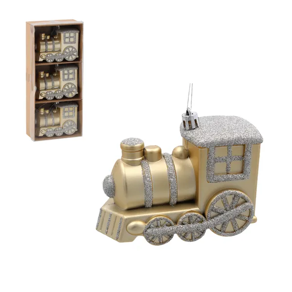 A játékvonat formájú karácsonyfadísz szett három darab, egyenként 10 cm hosszú dekorációt tartalmaz, amelyek élénk színeikkel és részletgazdag kidolgozásukkal azonnal vidám, nosztalgikus hangulatot varázsolnak a karácsonyfára.