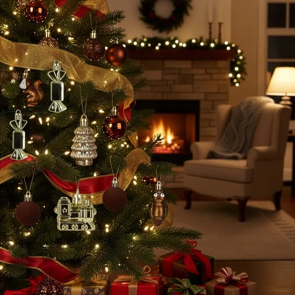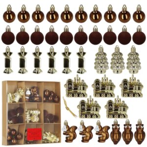 Törhetetlen, műanyag karácsonyfadísz válogatás meleg barna–arany–fehér színekben, fényes és bársonyhatású felületekkel. A készlet többféle formát ad a fához (gömb, cukorka, vonat, állatfigura), az akasztózsinórokat pedig ingyen mellékeljük a gyors díszítéshez.