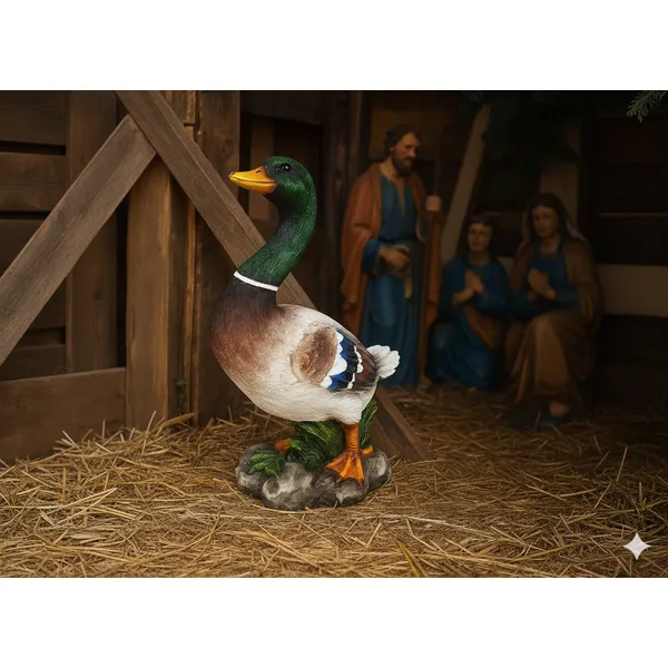 Varázsolj hihető, meghitt hangulatot betlehemedbe, otthonodba vagy intézményed díszletébe ezzel a 38 cm magas, kézzel festett kacsaszoborral! A műgyanta alapanyag részletgazdag kidolgozást és időjárásállóságot biztosít, így a figurát beltéren és kültéren egyaránt felhasználhatod éveken át.