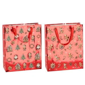 Elegáns, környezetbarát karácsonyi tasak mézeskalács motívummal, amely gyors és igényes csomagolást biztosít közepes méretű ajándékokhoz. Vastag papír és erős zsinórfülek óvják a meglepetést az átadásig.