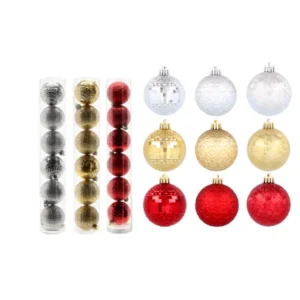 Hat darab, 6 cm-es, törhetetlen műanyag gömb piros, arany és ezüst színben, hogy gyorsan elegáns, egységes díszítést készíthess a fára vagy koszorúra. A mellékelt tároló tubus megóvja a dekorációt és rendezetten tartja a gömböket a következő szezonig.