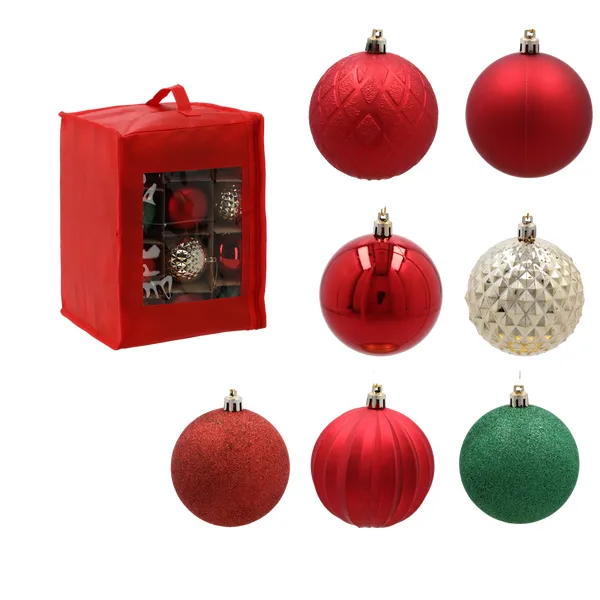 Az ünnepi hangulathoz elengedhetetlenek a ragyogó karácsonyfadíszek. Ebben a szettben 36 darab, 8 cm átmérőjű, könnyű és törésbiztos műanyag gömböt kap, piros, arany és ezüst színösszeállításban, amelyek minden stílusú fához illenek. A díszeket dekoratív, zsinóros piros tasakban szállítjuk, így a tárolás és az ajándékozás is gyerekjáték.
