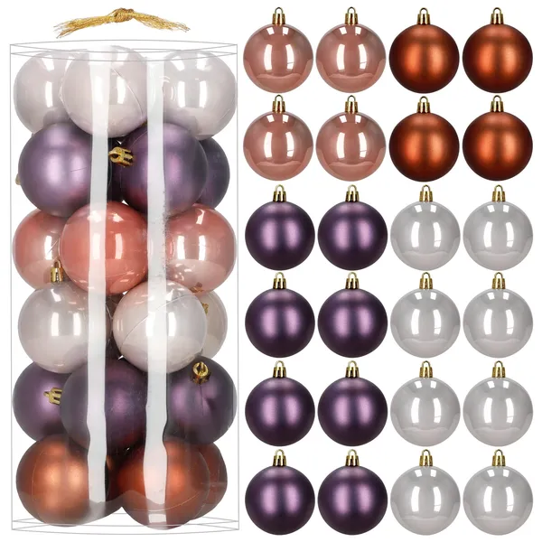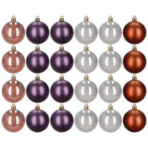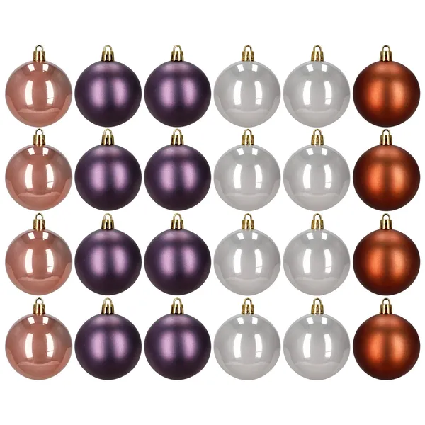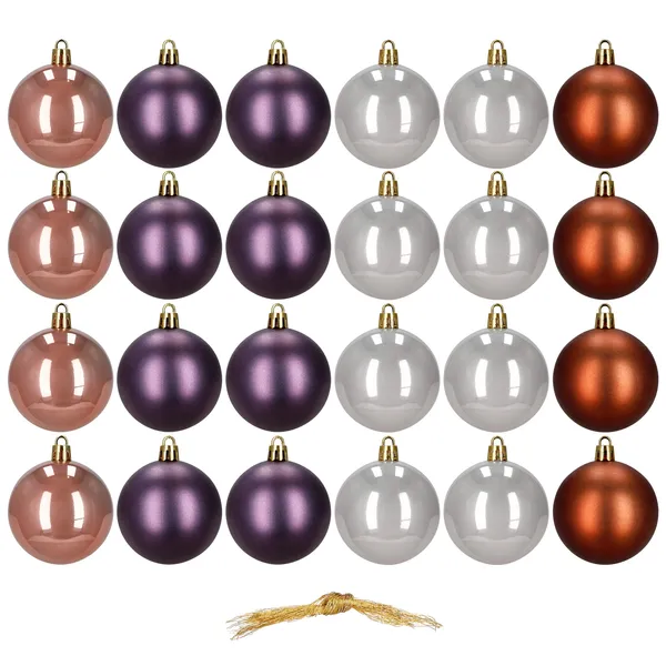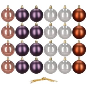 Az összehangolt, 24 darabos gömbkollekció fényes és selyemfényű felületeivel, gyöngyház, rózsaarany, ibolya és barna árnyalataival, valamint ingyenes akasztószálaival azonnali, törhetetlen ragyogást visz a karácsonyfára, miközben a könnyű műanyag biztonságos megoldást kínál gyermekes vagy háziállatos otthonok számára, kényelmes díszítést tesz lehetővé bármelyik helyiségben.