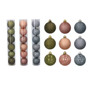 Hatdarabos, 6 cm átmérőjű gömbszett modern olíva, réz és grafit tónusokban, matt, fényes és csillogó felületekkel feldobja bármely karácsonyfát. A törésbiztos műanyag és az előre fűzött akasztók gondtalan, gyors díszítést garantálnak.