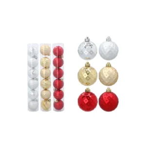 A 6 darabos, 6 cm-es piros, arany és ezüst gömbkészlet segítségével gyorsan egységes, ünnepi ragyogást adhatsz fádnak; a strapabíró műanyag és a praktikus tubusos tárolás hosszú távon is biztonságos, rendetlenségmentes díszítést tesz lehetővé.