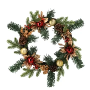 Elegáns piros-arany karácsonyi koszorú 40 cm átmérővel, élethű műfenyő alapból és tartós díszekkel, amely pillanatok alatt varázsol ünnepi hangulatot ajtón, falon vagy asztalon.