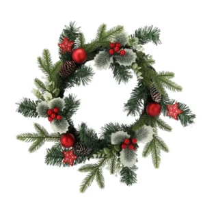 Legyen otthona meghitt fókuszpontja ezzel a 40 cm-es, élénk piros koszorúval, amelyet fényes magyallevelek és bogyók díszítenek. Tartós, újrahasználható kialakítása és előre rögzített akasztója révén percek alatt felhelyezhető bejárati ajtóra vagy kandallópárkányra.
