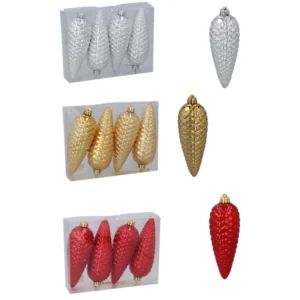 Frissítsd fel karácsonyfádat ezzel a látványos, kúp alakú díszkészlettel! A 14 cm magas díszek piros, arany és ezüst színben ragyognak, s köszönhetően tartós műanyag anyaguknak, törésbiztosak és többször is újra felhasználhatók.