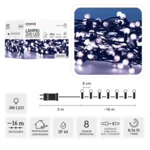 Bevonja otthonát ünnepi ragyogással a 19 méteres, 200 darab, cseresznye alakú, hidegfehér LED-et tartalmazó fényfüzér. Kültéren és beltéren egyaránt biztonságosan használható, IP44 védettséggel és alacsony, 31 V-os üzemfeszültséggel.