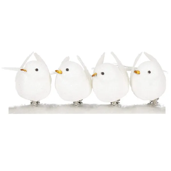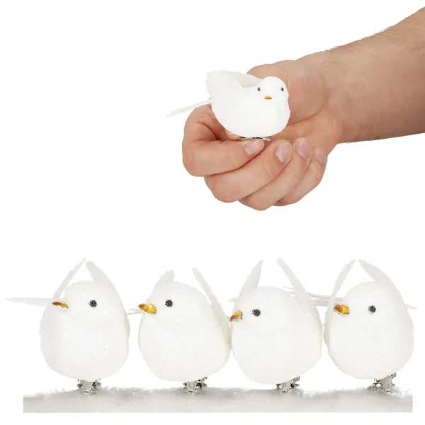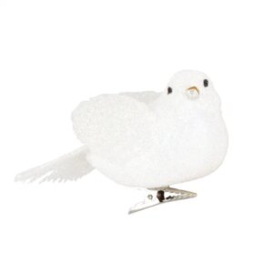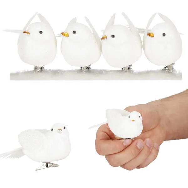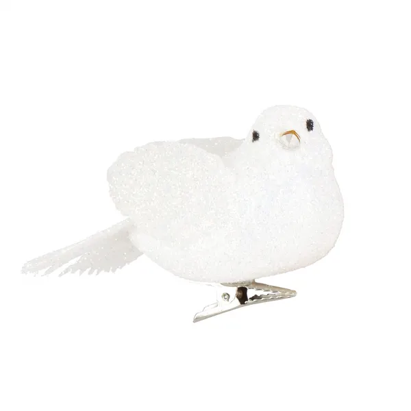 Karácsonyi madár dísz 4 db, csipeszes, fehér, csillámos, 8 cm