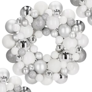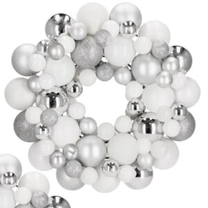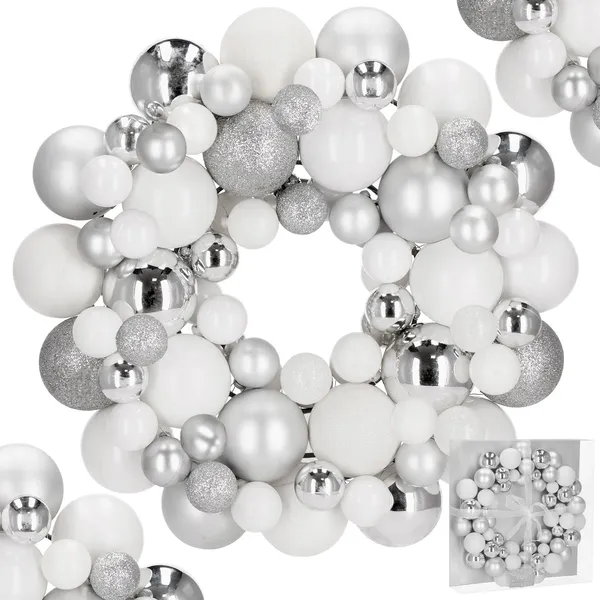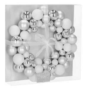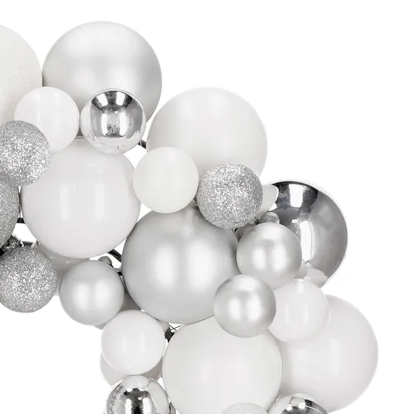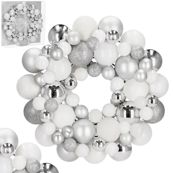 A 34 cm átmérőjű, ezüst és gyöngyház árnyalatú karácsonyi koszorú 55 darab, különböző méretű műanyag gömbdísszel készült. A koszorú nem törékeny, ezért biztonságos választás gyermekekkel vagy háziállatokkal élőknek is.