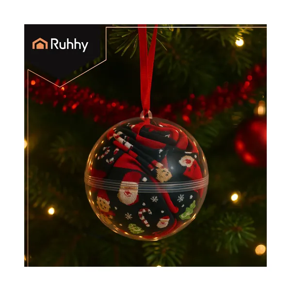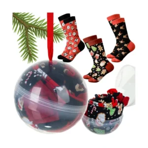 A 3 páras, karácsonyi mintás pamutzokni szett egyszerre praktikus és ajándéknak kész meglepetés. A zoknik egy elegáns, felakasztható díszgömbben érkeznek, így csomagolás nélkül is betehető a fa alá vagy adható mikulásra. A puha, légáteresztő anyag egész nap kényelmes, a rugalmas szegély pedig szépen illeszkedik.