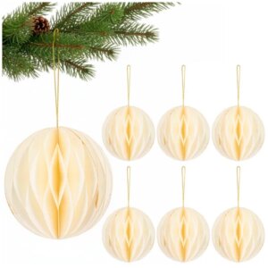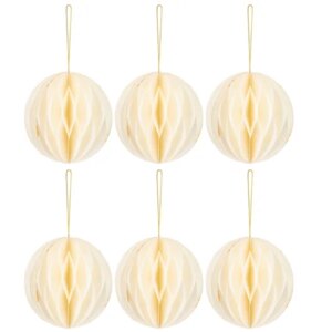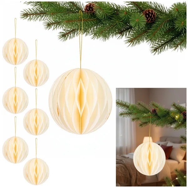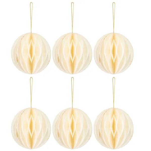 Fehér-arany csillámos papír gömbdíszek, amelyek mágneses záródásuknak köszönhetően gyorsan összeállíthatók és szépen tartják a formájukat. A csomag 6 darabot és ajándék arany akasztózsinórokat tartalmaz, így percek alatt elegáns ünnepi hangulatot teremthetsz a fára vagy a lakásba.