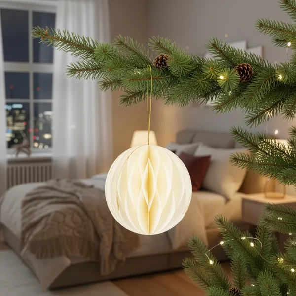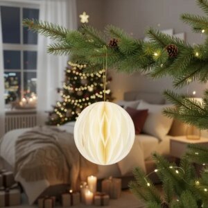Hangulatos, elegáns karácsonyi dekoráció fehér papírból arany csillámos részletekkel. A gömb forma mágneses záródással könnyen összeállítható és biztonságosan rögzíthető, a csomagban pedig arany akasztózsinórok is járnak.